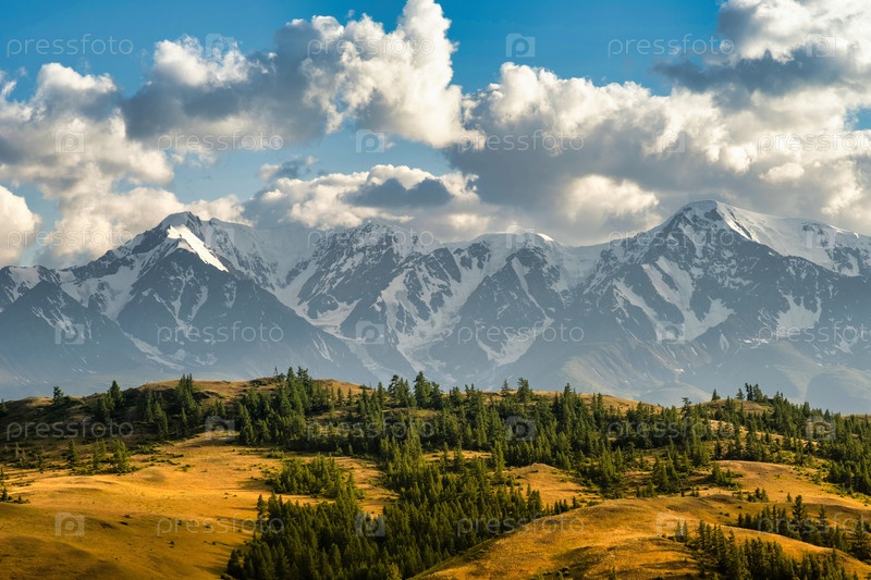Потрясающий горный пейзаж с величественными заснеженными вершинами, пышно-зелеными лесами и золотыми лугами под чистым голубым небом с пушистыми белыми облаками. Алтай