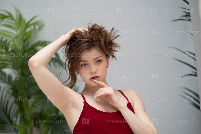 Красивая молодая женщина позирует в красном платье в студии