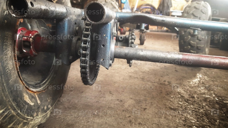Подробный вид механизма задней оси и цепи на внедорожнике в условиях мастерской днем