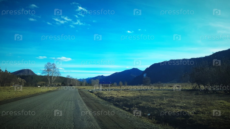 Горы и голубое небо доминируют над сценой тихой сельской дороги в ранние дневные часы рядом с безмятежным пейзажем