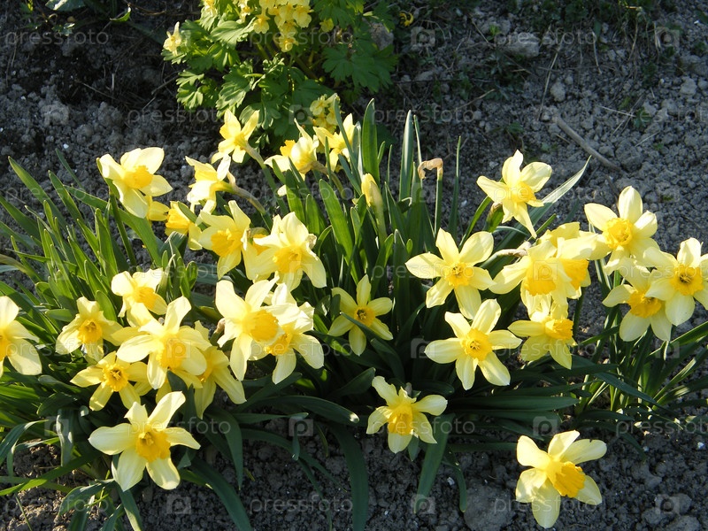 Ярко-желтые нарциссы цветут в солнечном весеннем саду возле скалистой тропинки