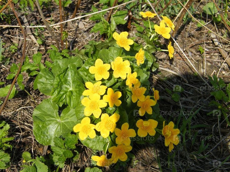 Желтые дикие цветы обильно цветут на пышной зеленой лужайке весной