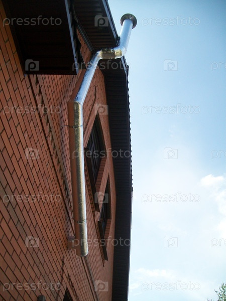 Стальная дренажная труба простирается от кирпичного здания до чистого неба