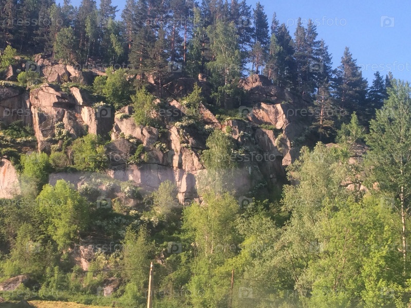 Скалистая скала, окруженная пышным зеленым лесом под чистым голубым небом в спокойной атмосфере на открытом воздухе