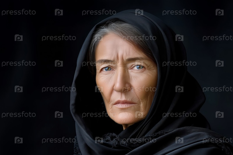 Портрет пожилой женщины в черном хиджабе на чёрном фоне