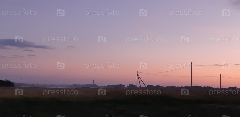 Закат солнца над спокойным сельским пейзажем с линиями электропередач, установленными на фоне красочного неба