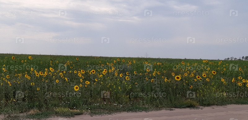 Поле подсолнечника простирается к горизонту под облачным небом в сельском пейзаже в конце дня