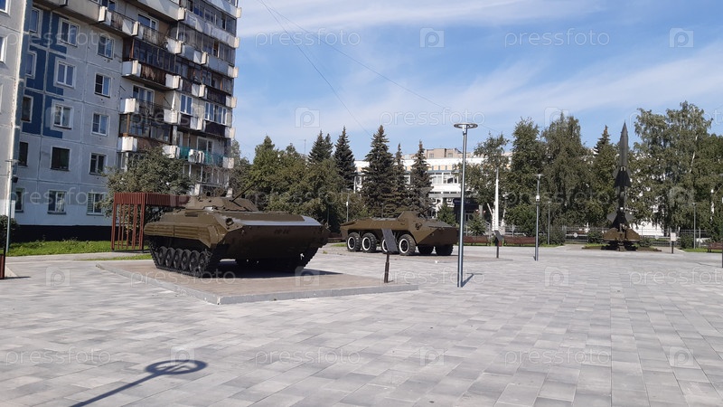 Площадь Жукова, Новокузнецк, Кемеровская область - Кузбасс - Военные машины выставлены в городском парке в солнечный день, демонстрируя историческую военную технику