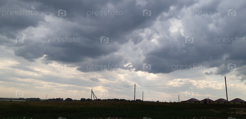 Облачное небо с драматическими облаками, висящими над сельским пейзажем в начале вечера