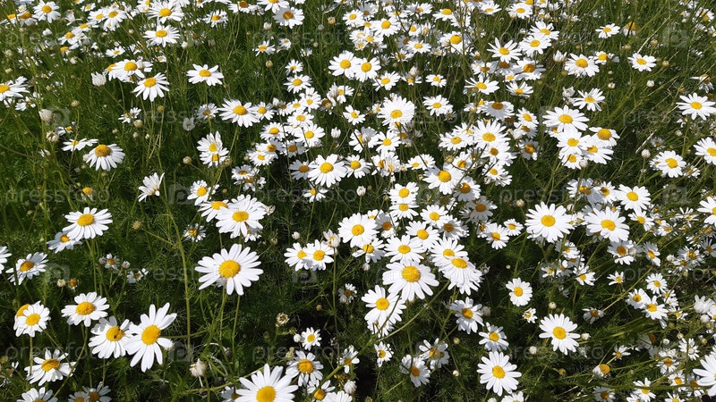 Красивое изображение ромашек, цветущих на солнечном лугу с пышной зеленой травой и яркими цветами