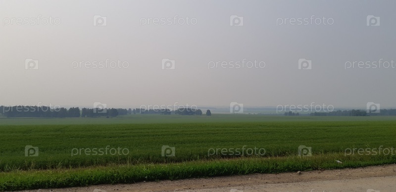 Спокойный вид на зеленые поля под туманным небом летом днем в сельской местности