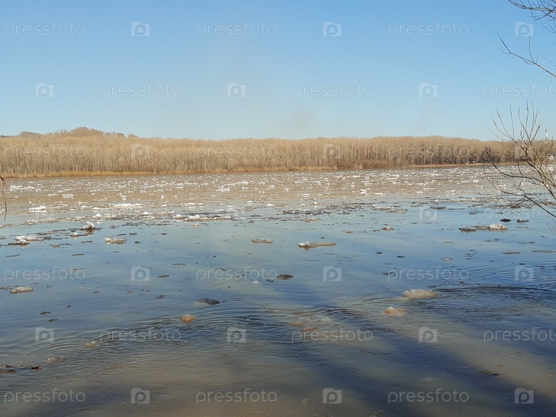 Фрагменты льда плавают на реке под чистым голубым небом в конце зимнего дня