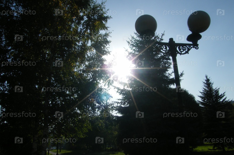 Солнечный свет фильтрует деревья при помощи уличного фонаря в тихом парке днем