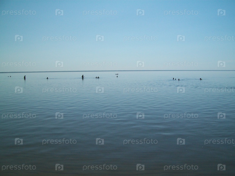 Спокойные воды отражают чистое небо, когда люди наслаждаются расслабляющим днем на пляже в спокойном месте