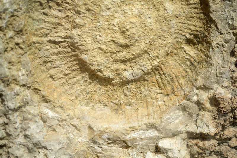 Приблизительный взгляд на скалу показывает ископаемый отпечаток, вероятно спиралевидный аммонит, встроенный в светло-бежовый и солнечный камень