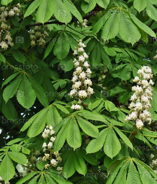Листья и цветы конского каштана, на фоне свежей весенней лиственницы с белыми клумбами цветов
