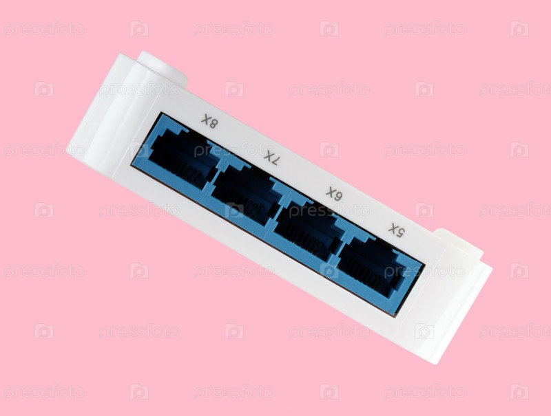 Белый 8-портный пластиковый коммутатор Ethernet изолирован на розовом фоне в сухой день