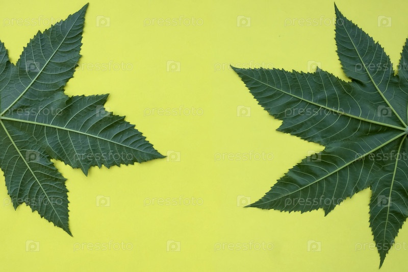 Два больших листа тропического дерева на желтом фоне