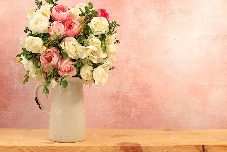 Красивая цветовая открытка, Смертное тело со сливочным чаем и розовыми цветами бедра на элегантном современном столе, Абстрактная цветочная аранжировка. Шаблон для вашего дизайна, минималистическая концепция красоты