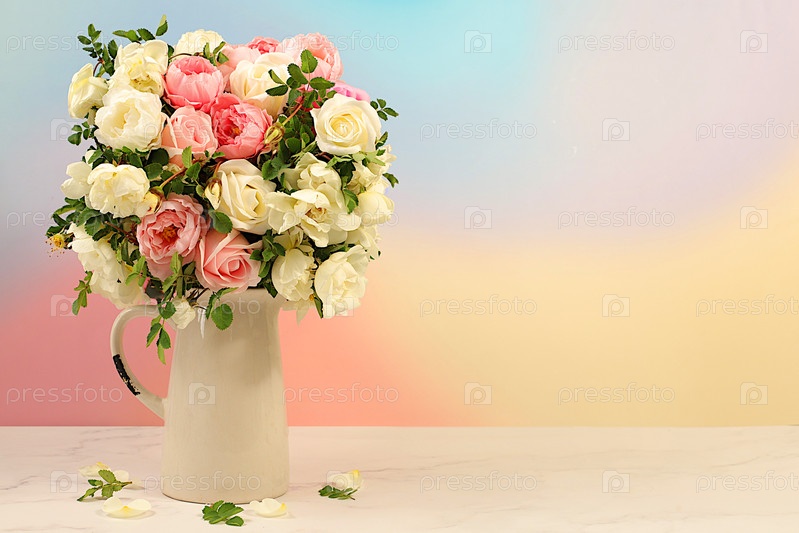 Красивая цветовая открытка, Смертное тело со сливочным чаем и розовыми цветами бедра на элегантном современном столе, Абстрактная цветочная аранжировка. Шаблон для вашего дизайна, минималистическая концепция красоты