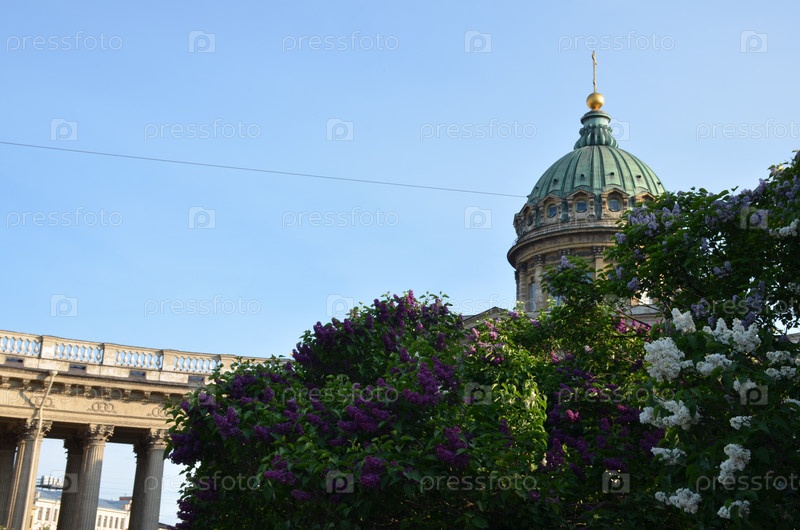 Казанский собор в Санкт-Петербурге в солнечный летний день, цветущие лилии