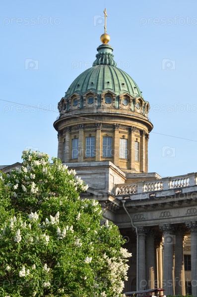 Казанский собор в Санкт-Петербурге в солнечный летний день, цветущие лилии