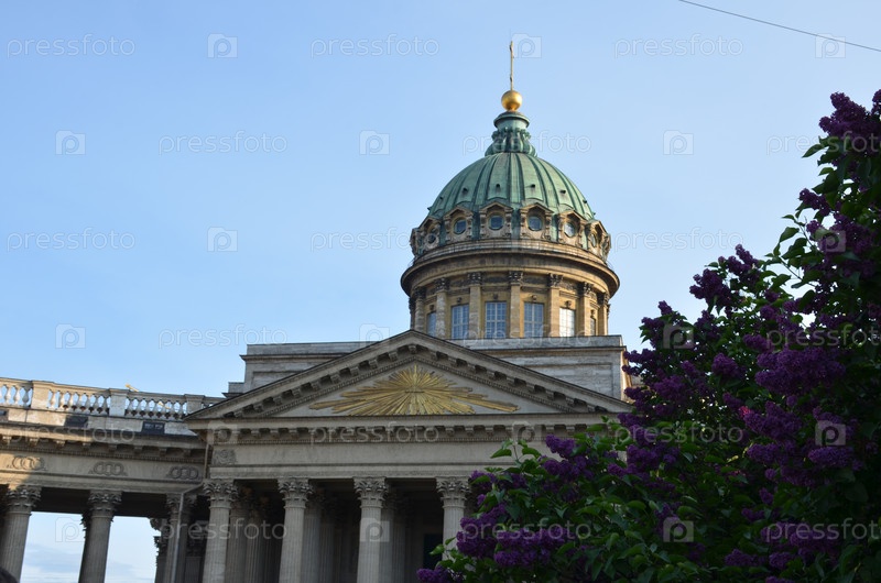 Казанский собор в Санкт-Петербурге в солнечный летний день, цветущие лилии