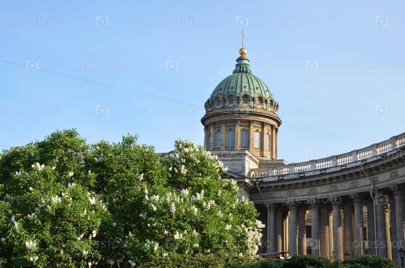 Казанский собор в Санкт-Петербурге в солнечный летний день, цветущие лилии