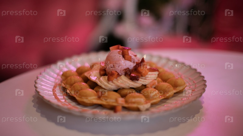 Вафлевый десерт с шариком мороженого, клубницей и бананом на тарелке