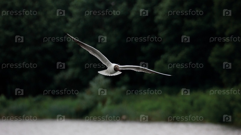 Озерная чайка в полете над водой на фоне деревьев