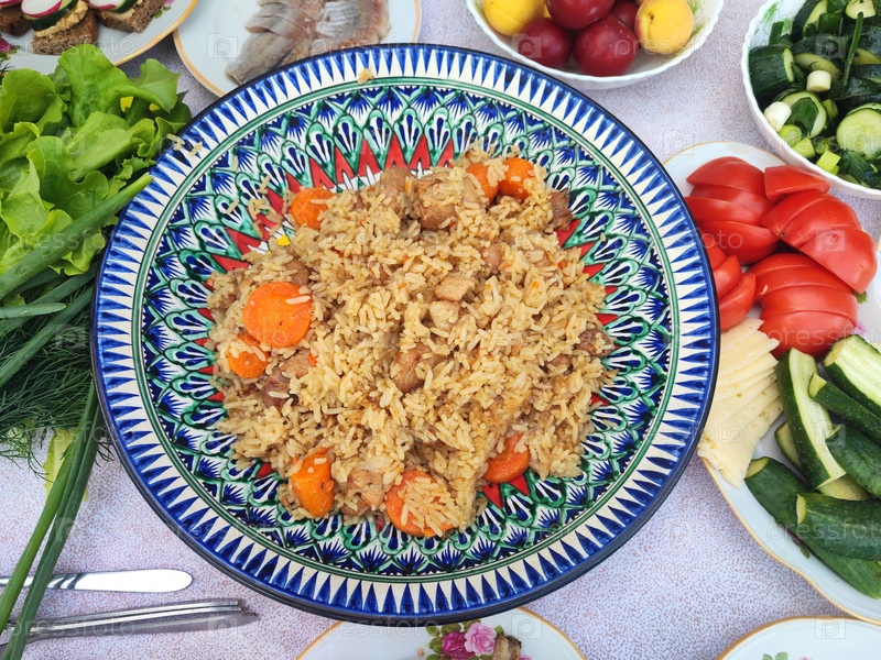 Плов, приготовленный в Казани, выкладывается на голубую большую плоскую тарелку с традиционным узбекским узором
