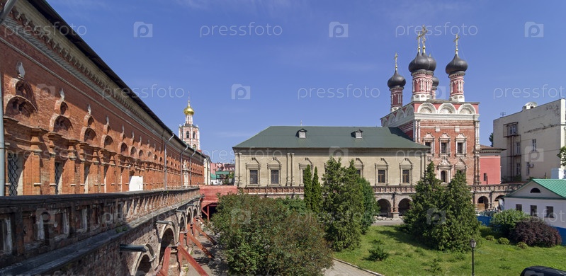 Камеры Нарышкина и храм святого Сергия Радонежского в Высокопетровском монастыре.Москва, улица Петровка.Солнечный день июня