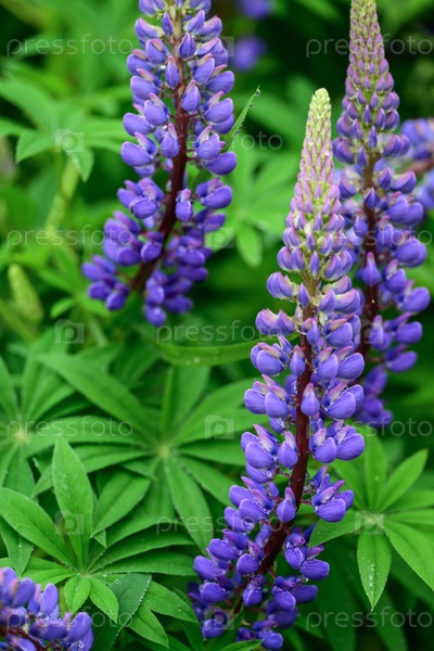 Фиолетовый люпин цветет среди зеленых листьев