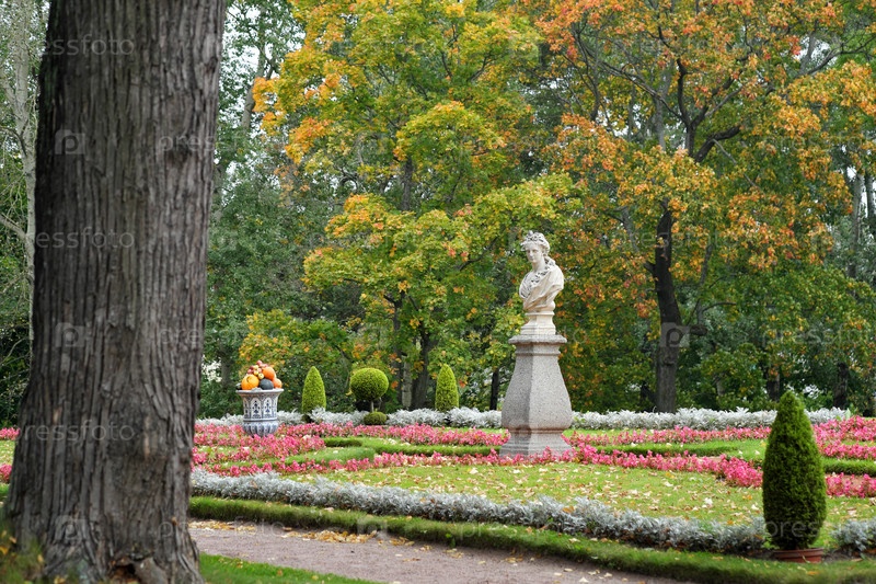 Осенний парк и глиняная китайская ваза с овощами.Петра I Парк Палац Путевого в Санкт-Петербурге