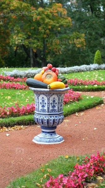 Осенний парк и глиняная китайская ваза с овощами.Петра I Парк Палац Путевого в Санкт-Петербурге