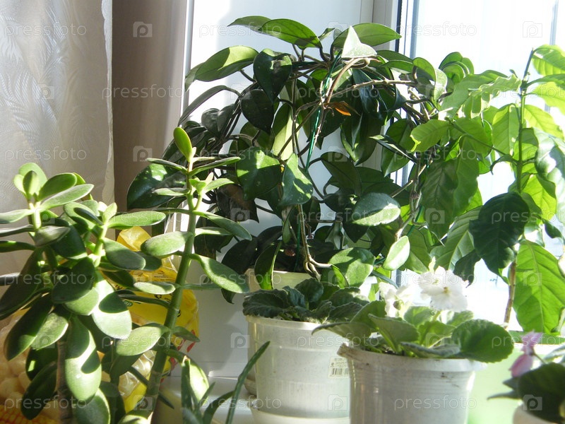 Внутренний сад, показывающий различные зеленые растения возле окна днем с естественным солнечным светом, освещающим листву, создавая спокойную атмосферу