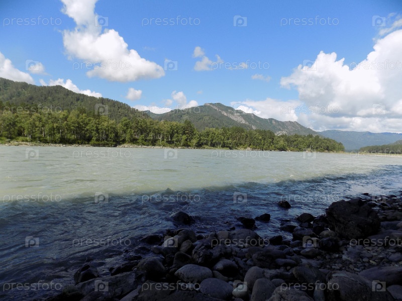 Река Катун - река Серена течет мимо скалистого берега под голубым небом с разбросанными облаками в горном пейзаже в полдень