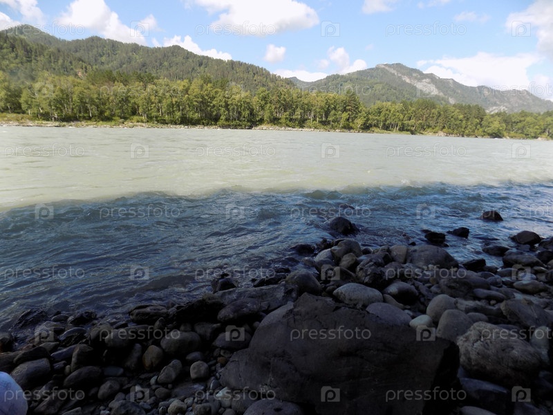 Река Катун - река Серена течет мимо скалистого берега под голубым небом с разбросанными облаками в горном пейзаже в полдень