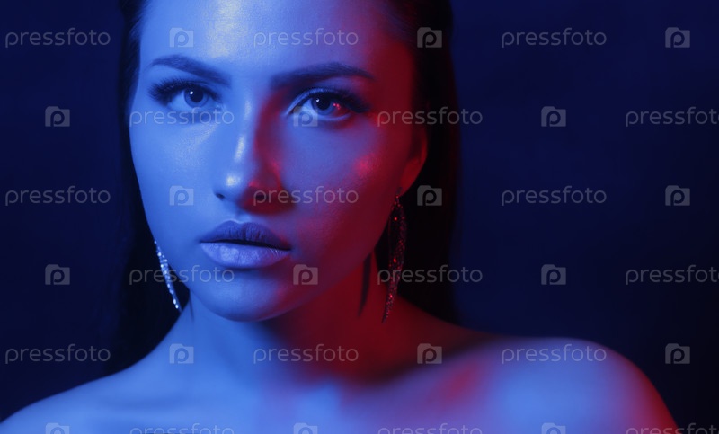 Молодая девушка в ближайшем плане при ярком неоновом свете. модный легкий макияж. концепция трендового изображения и неонного света