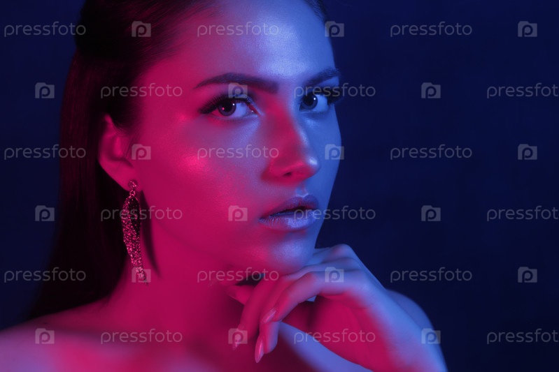 Молодая девушка в ближайшем плане при ярком неоновом свете. модный легкий макияж. концепция трендового изображения и неонного света