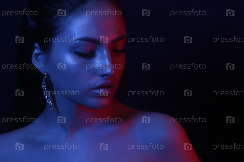 Молодая девушка в ближайшем плане при ярком неоновом свете. модный легкий макияж. концепция трендового изображения и неонного света