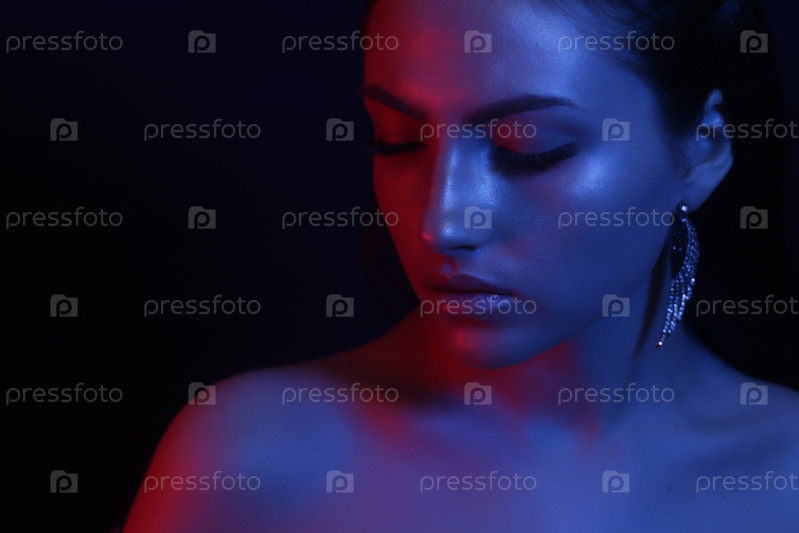 Молодая девушка в ближайшем плане при ярком неоновом свете. модный легкий макияж. концепция трендового изображения и неонного света