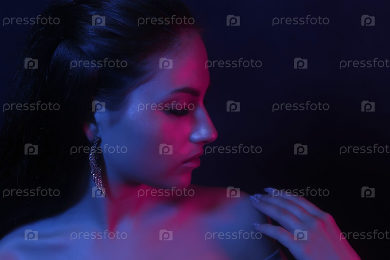 Молодая девушка в ближайшем плане при ярком неоновом свете. модный легкий макияж. концепция трендового изображения и неонного света