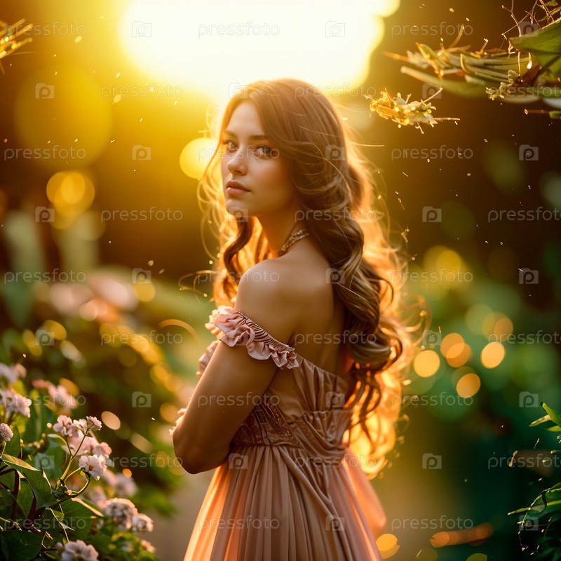 Девушка в лесу среди заходящего солнца