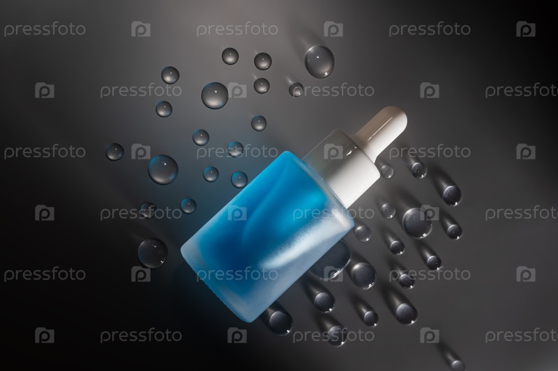 Синяя бутылка капельницы сыворотки на сером цвете с каплями воды