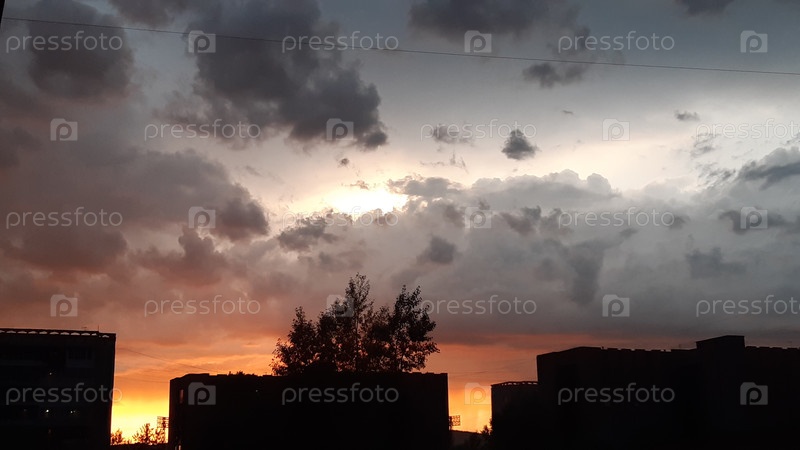 Драматический закат над горизонтом города с темными облаками, собирающимися в вечернем небе