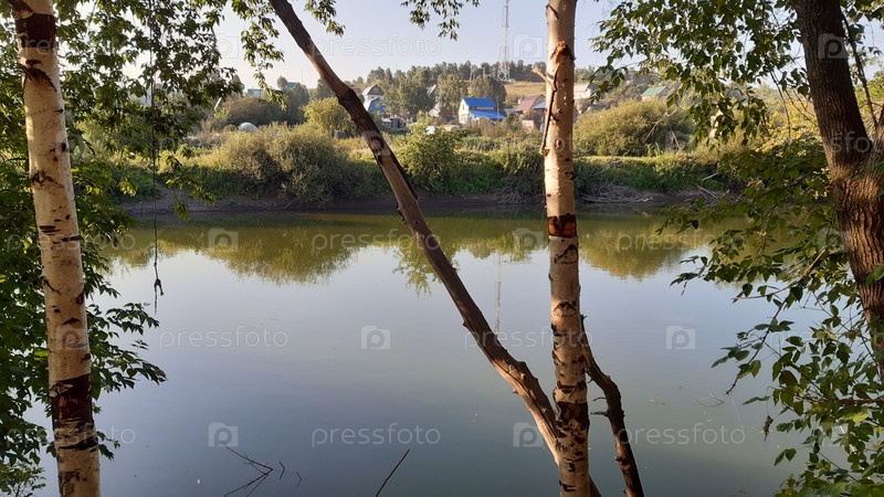 Серая вода отражает деревья и ландшафт под ясным небом в тихой сельской местности
