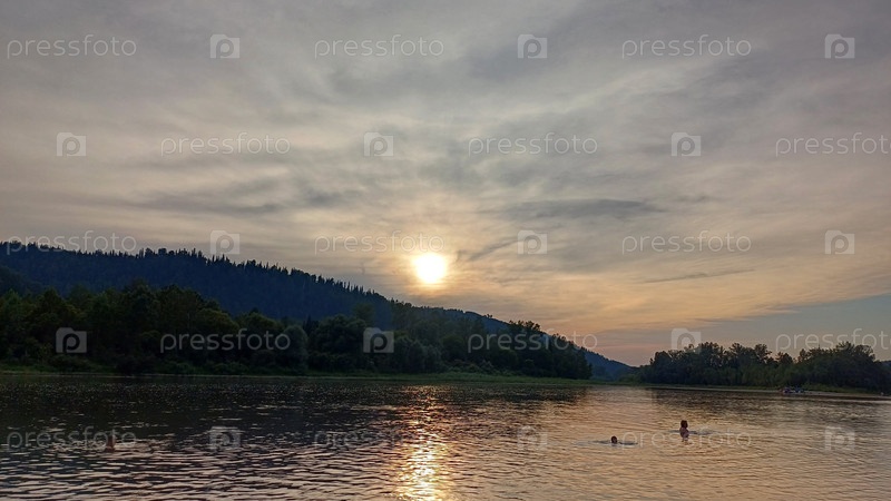 Закат солнца над спокойной рекой с купальщиками, наслаждающимися теплым вечером в естественной обстановке возле лесистых холмов