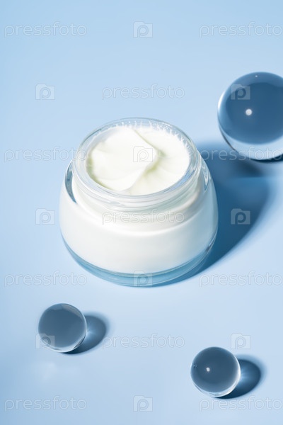 Открытая кремовая банка со стеклянными охлаждающими шарами на ярко-синем фоне. свежая, роскошная квартира по уходу за кожей для спа-брендов и визуальной текстуры продукта