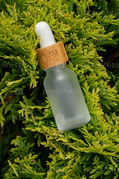 Бутылка капельницы из матового стекла расположена среди пышных зеленых ветвей растений, сливая чистую красоту с природой.Новая ботаническая концепция ухода за кожей для органического здоровья и биофильной эстетики